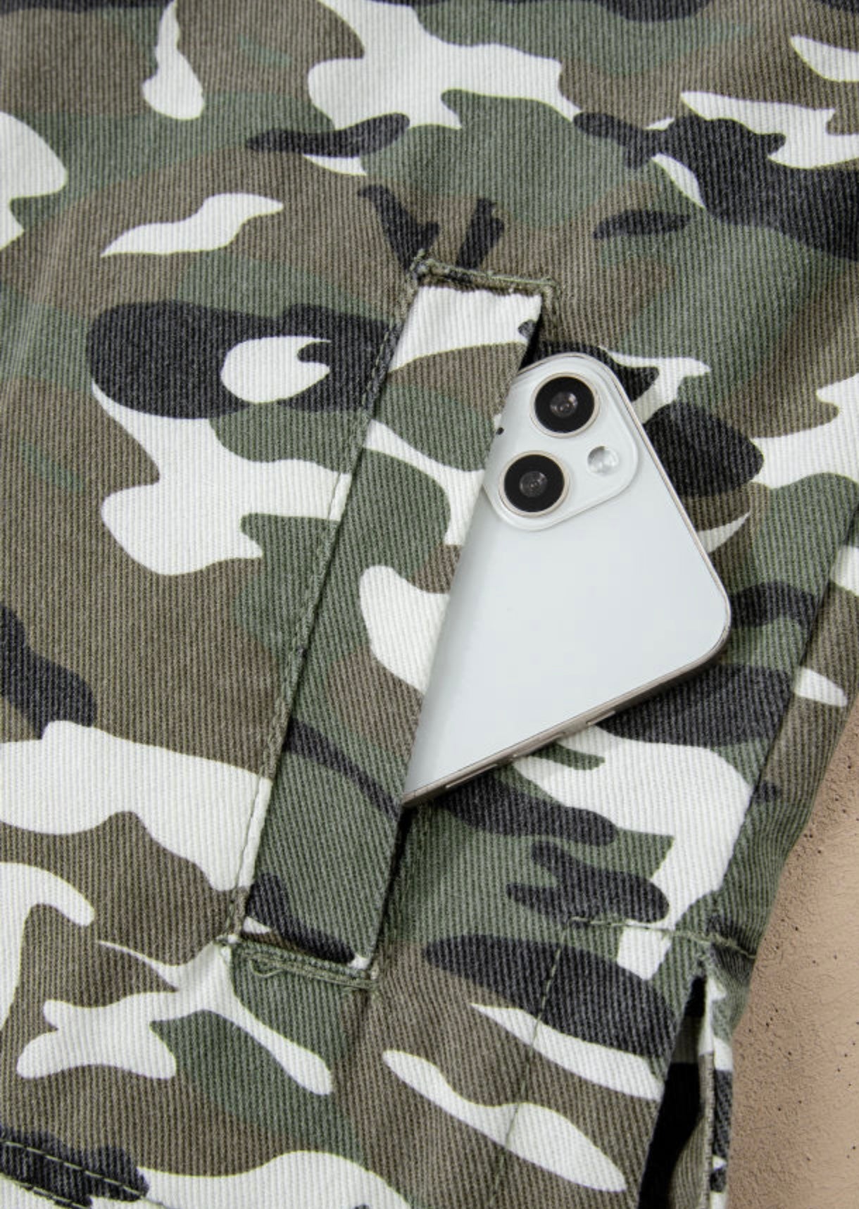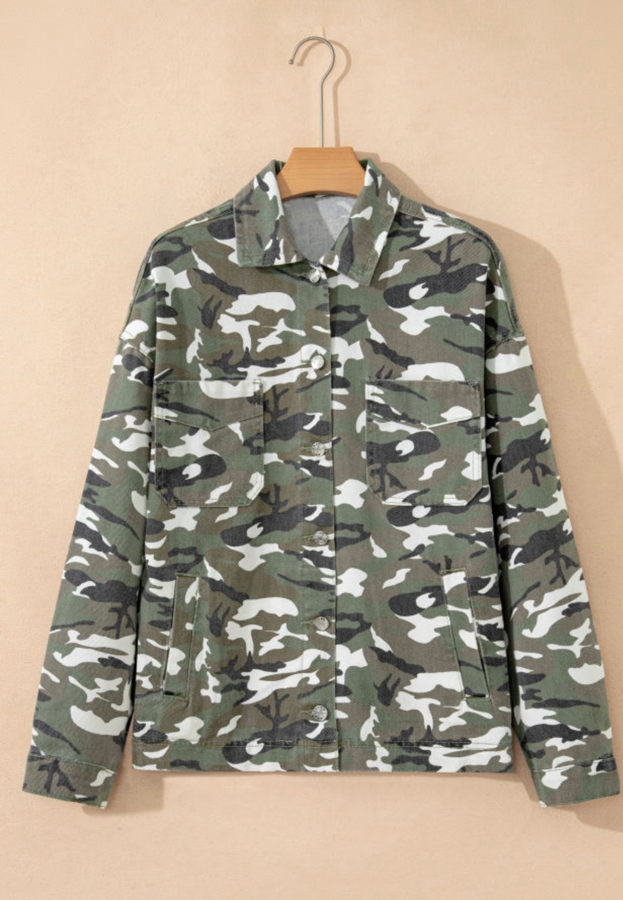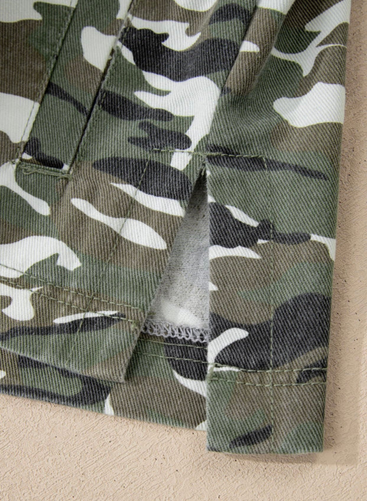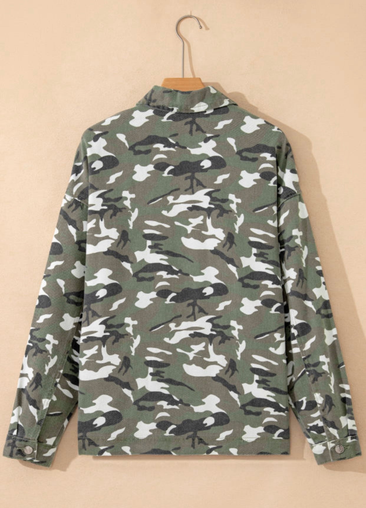 Rock that camo aesthetic with this loose-fitting denim jacket that's ready for anything. Dual chest pockets keep your essentials within reach, while the relaxed silhouette lets you layer it over your favorite sweaters without any fuss. Built from sturdy denim that only gets better with time, this collared, button-front piece brings that effortless outdoor vibe to your everyday rotation. Long sleeves and timeless construction mean you'll reach for it season after season.